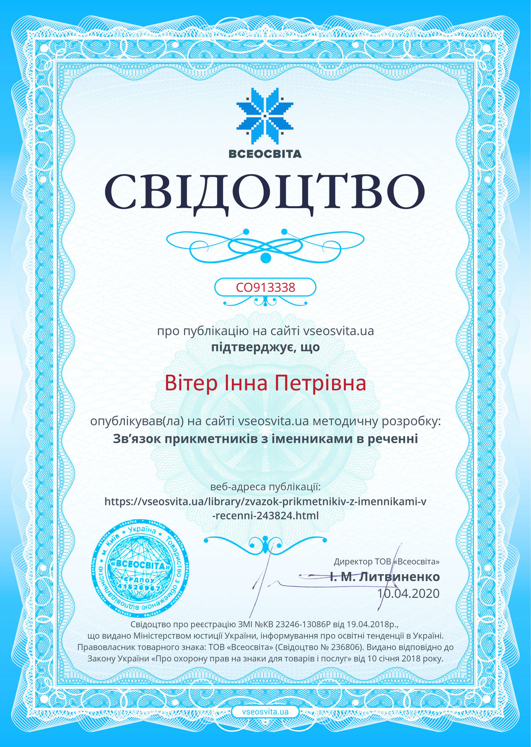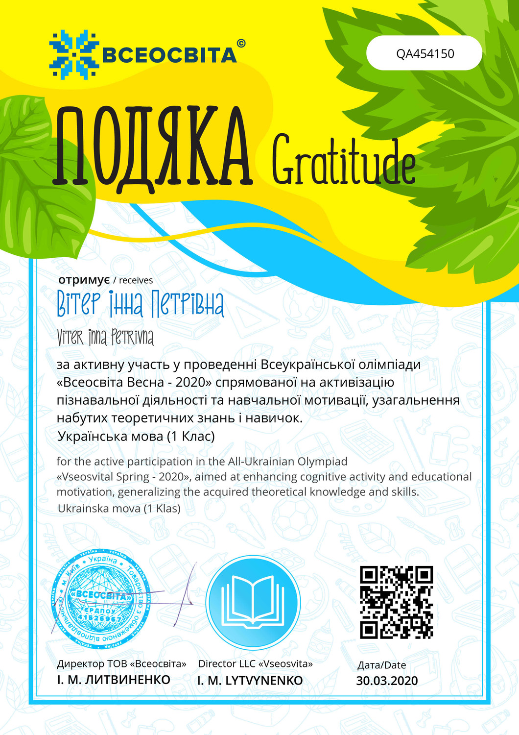 2020р.- Свідоцтво про підготовку переможців VІI Всеукраїнської інтернет олімпіали (осінь) «На урок» з математики, ЯДС, предмети початкової школи, українська мова та література, інформатика.