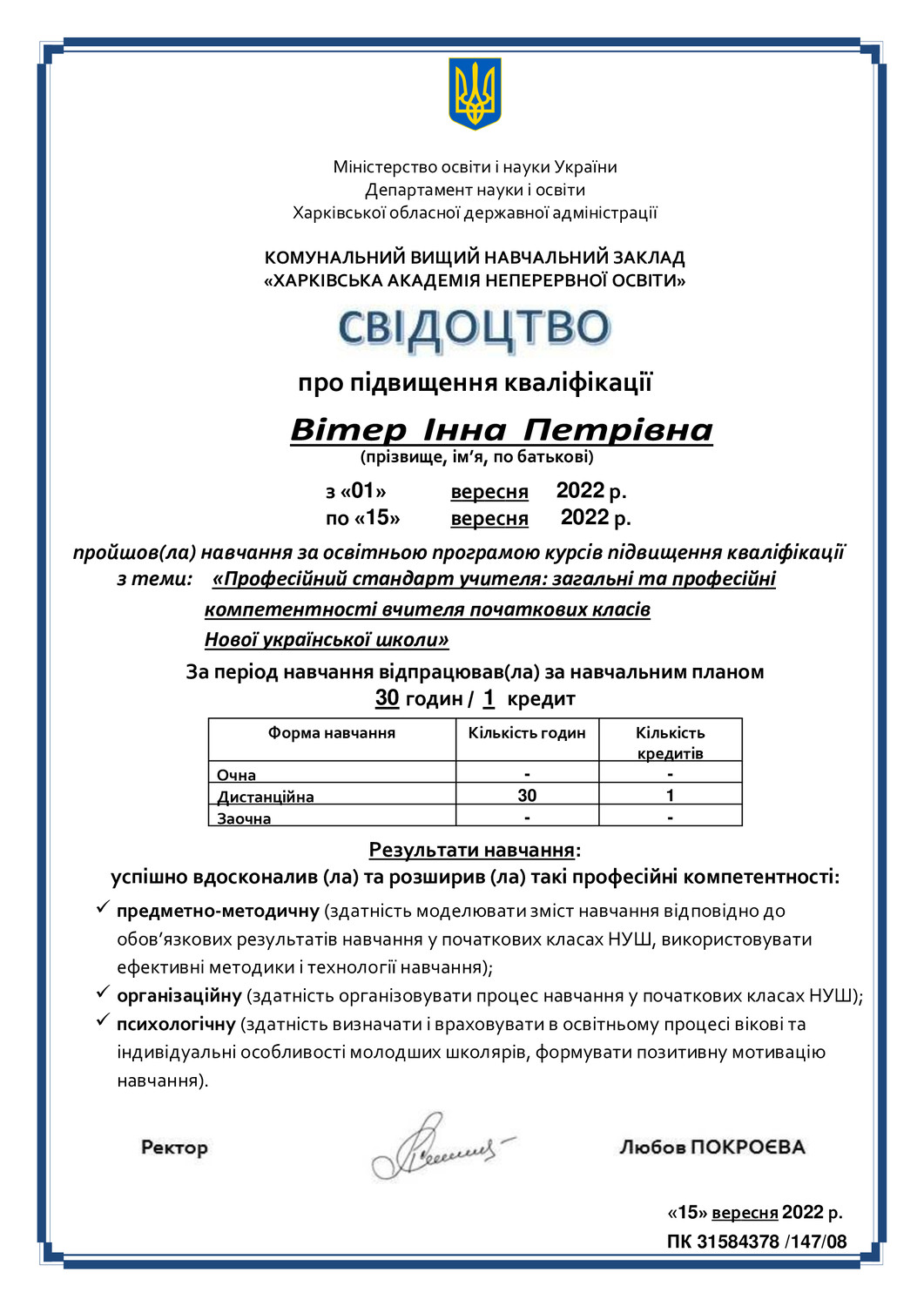 З 01.09 по 15.09.2022 - пройшла навчання за освітньою програмою курсів підвищення кваліфікації ХАНО з теми: Професійний стандарт учителя: загальні та професійні компетентності вчителя початкових класів Нової української школи»